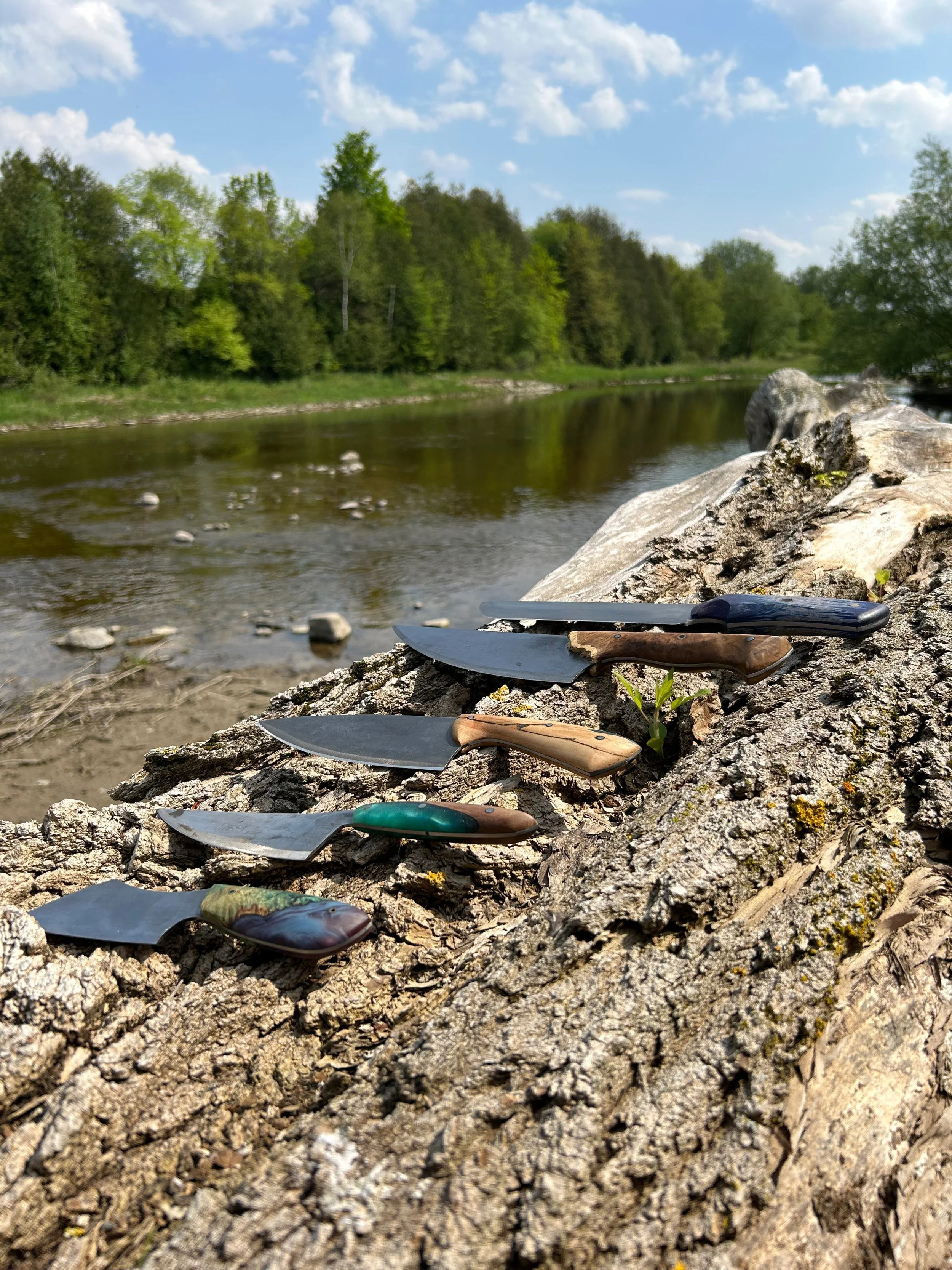 Forged metal spatulas with custom wooden handles displayed on a fallen tree by a river in a natural setting.